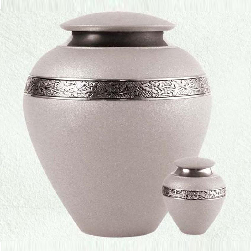 The Anoka Series is made of brass and features a classic leaf design that encircles the urn. These urns are finished with a matte, textured paint and the Shimmering Grey urn also features metallic highlights that provide a beautiful shimmer. Keepsake comes in a velour presentation box.